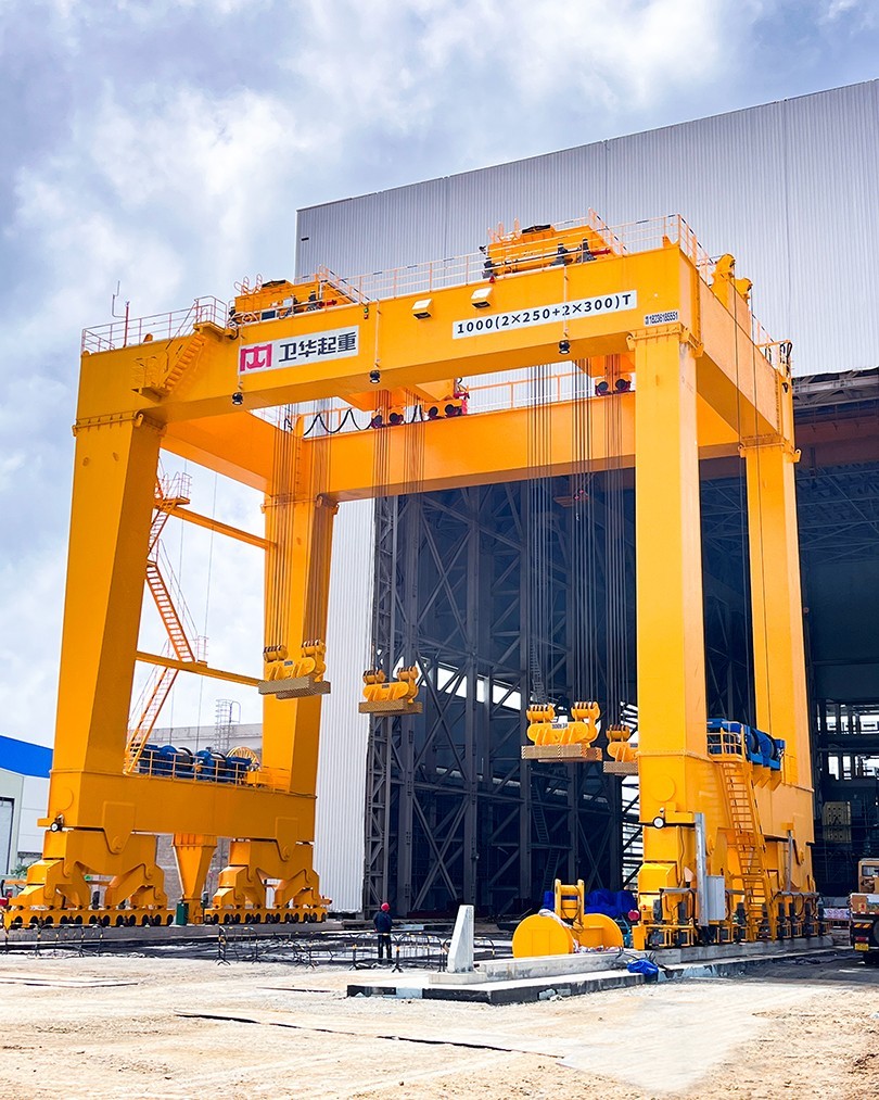 根据项目起吊重量大、工况复杂、控制精度高等特点,beats365起重机采用U型门架结构,双龙门四点吊装,最大起吊重量1000t,最大吊点高度大于18m,采用变频+PLC控制,可实现横向、纵向距离可调,及吊梁自由旋转,控制精度达±1mm。